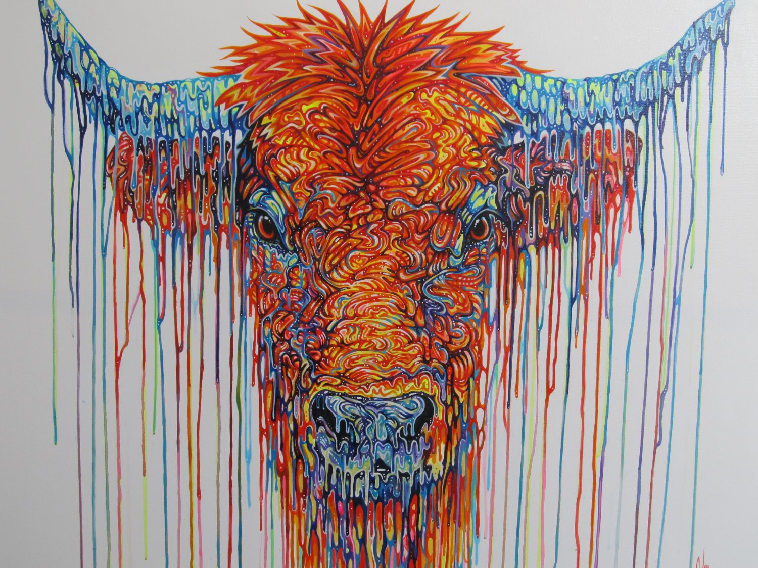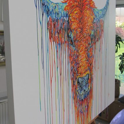Once again Robert Oxley, well known for his psychedelic colour, intricate detail and fluid expressive brushwork has captured the wonderful playful nature of these beautiful cows. A regular sight in the countryside around where Robert lives, he sees them grazing in all weathers and currently enjoying the spring grass with calves close by. With such an inquisitive , playful and occasionally boisterous nature, they are beautiful to watch.